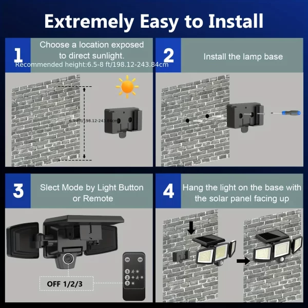 【Remote Control & 3 Lighting Modes】:Each solar motion sensor light is equipped with wireless remote control.You can choose the most suitable mode faster and more portable: ①Strong light sensor mode ② Dim light sensor mode ③Strong long light mode. Different lighting way for your daily requirement.