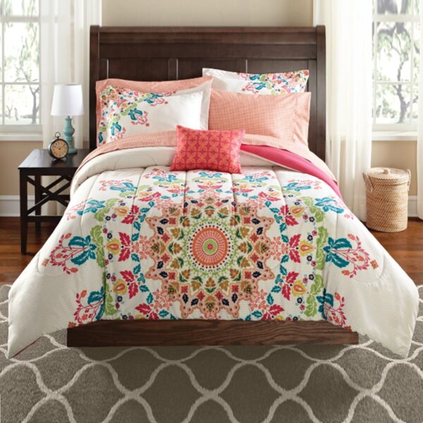 Update your bedroom or dorm room with this stylized and bold Multi-Medallion bedding Set. The reversible comforter allows you to change the look of your room with a flip of a comforter. The comforter features a large-scale offset medallion in bright colors and reverses to a coral pink solid. The sham design further highlights the global style inspiration. This complete bed set comes with a decorative pillow to complete the look.